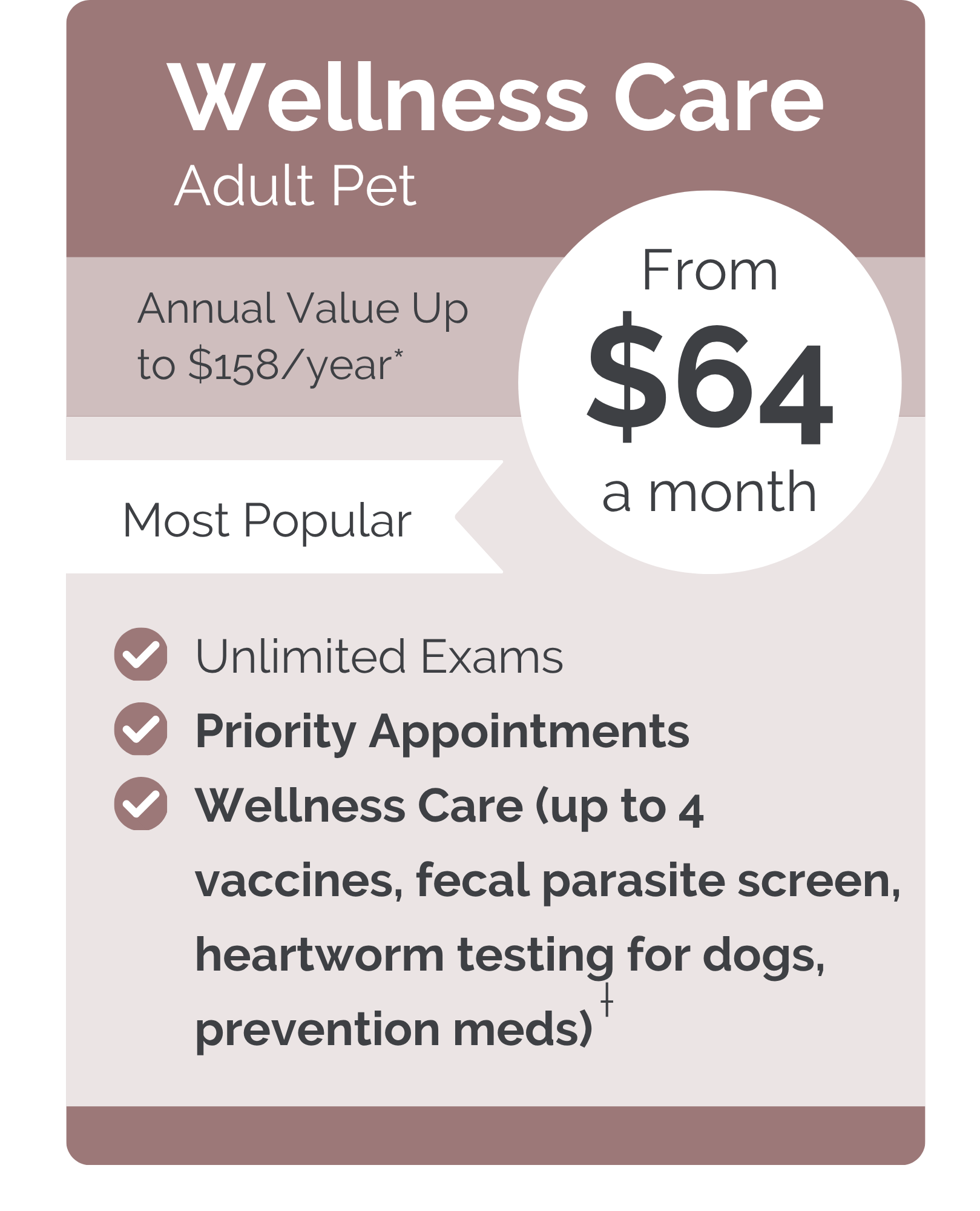 Plus, with our Wellness Care plans, you’ll enjoy priority appointments with same- or next-day scheduling whenever possible. Spread out the cost of services throughout the year, so you can give your pet the care they need without any financial stress.